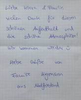 Hallo Frau Müller, es ist zwar schon ein paar Wochen her als wir bei Ihnen zu Gast sein durften, aber es hat uns so gut bei Ihnen gefallen, daß wir uns auf diesem Weg nochmals recht herzlich bedanken möchten.Die Zimmer und Ihr Haus sind einfach spitze. Wir sagen auch nochmals vielen Dank für Ihre freundliche Aufnahme und Betreuung im Namen unserer "Hochzeitsgesellschaft". Es hat allen viel Freude und Spaß bei Ihnen gemacht. Viele Grüsse